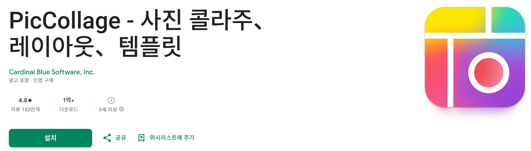 PicCollage는 Cardinal Blue Software, Inc.에서 개발한 사진 콜라주 앱으로, 평점 4.8과 176만 개 이상의 리뷰, 5,000만 회 이상의 다운로드를 기록했습니다. 프레임, 자유형식 콜라주, 다양한 템플릿을 활용해 창의적인 콜라주를 제작할 수 있으며, 풍부한 스티커와 배경, 폰트를 제공합니다.
