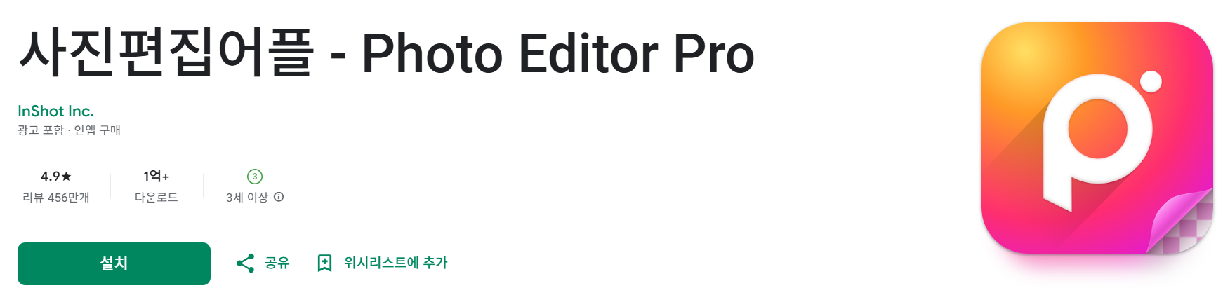 Photo Editor Pro는 InShot Inc.에서 개발한 사진 편집 앱으로, 평균 평점 4.9점과 390만 개 이상의 리뷰를 기록하며 1억 회 이상 다운로드되었습니다. 광고가 포함되어 있으며, 일부 고급 기능은 인앱 구매를 통해 사용할 수 있습니다. 사진 편집과 콜라주 제작을 위한 폭넓은 기능을 제공하여 초보자도 전문가 수준의 작업이 가능합니다.