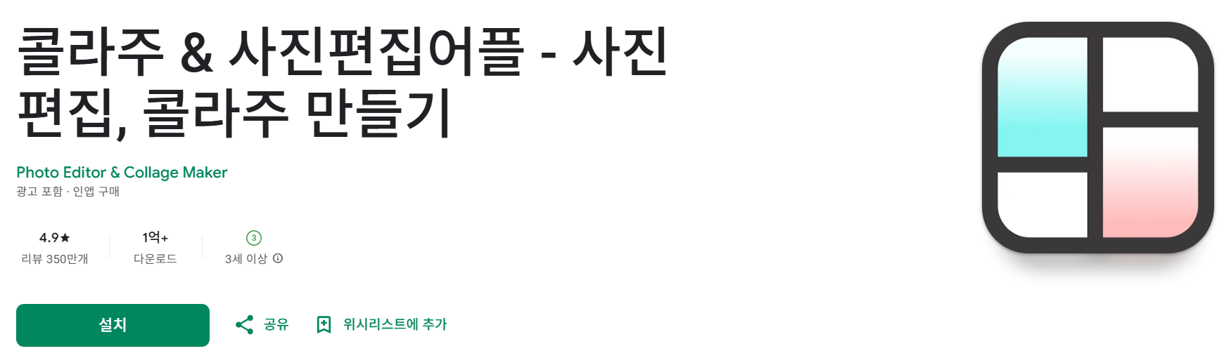 콜라주 & 사진편집어플은 Photo Editor & Collage Maker에서 제공하는 인기 앱으로, 별점 4.9를 기록하며 285만 개 이상의 리뷰와 1억 회 이상의 다운로드를 달성했습니다. 이 앱은 사용자가 손쉽게 사진을 편집하고 개성 있는 콜라주를 제작할 수 있도록 다양한 도구와 옵션을 제공합니다.