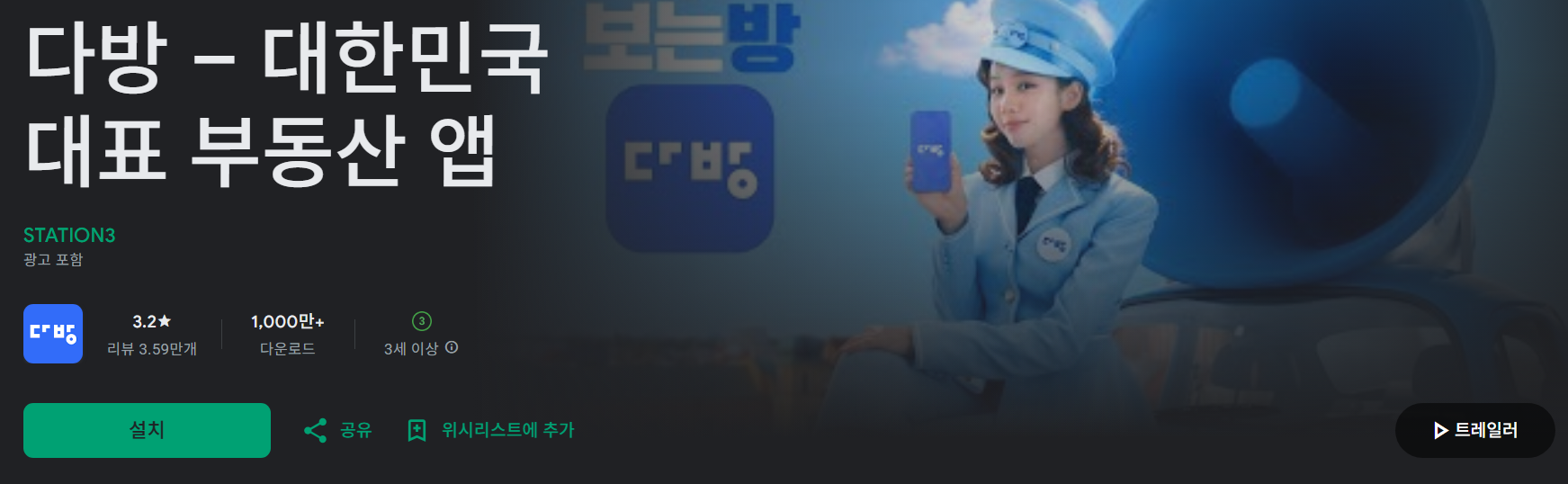 국내 최초 오픈형 부동산 플랫폼으로, 원룸부터 아파트까지 모든 부동산 정보를 한곳에서 확인할 수 있는 앱입니다. 다양한 수상 경력을 보유한 ‘다방’은 사용자 맞춤형 기능과 안전한 거래 서비스를 통해 많은 사랑을 받고 있습니다.