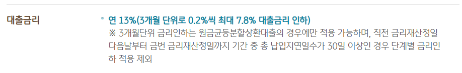 - 원금균등분할상환 방식에 한해, 3개월마다 0.2%씩, 최대 7.8%까지 단계적으로 금리 인하가 가능합니다.