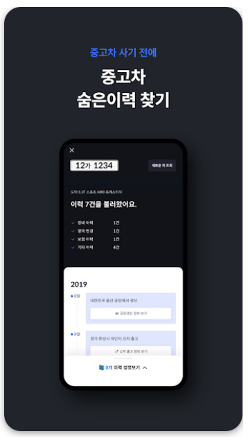 • 차량 보험, 정비, 용도 이력 등 19가지 항목 무료 조회 가능