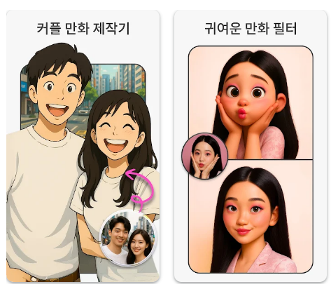 - "앱에서 제공하는 필터 종류가 정말 다양해서 매번 다른 스타일의 만화 이미지를 만들 수 있어요. Ghibli풍, 캐리커처, 3D 느낌 등 원하는 분위기를 선택할 수 있어서 재미있습니다."