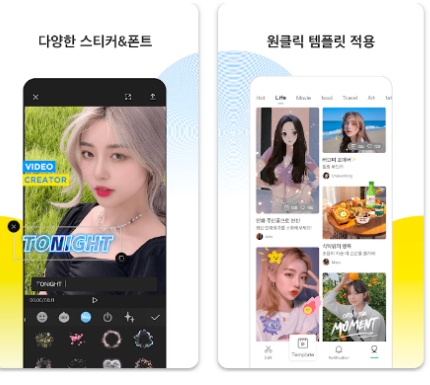 - 스티커·자막: 5,000개 이상의 스티커와 트렌디한 폰트 제공