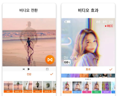 - 틱톡 효과: VHS, glitch 등 50개 이상의 인기 효과 제공